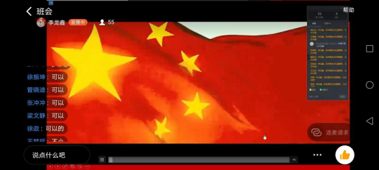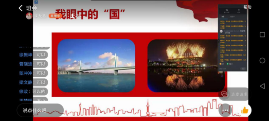 爱国主义强调个人与祖国之间关系的道德要求,也是民族精神的核心。而民族精神是一个民族在长期共同生活和实践中形成和发展起来的价值取向,是一个民族赖以生存的精神支柱。为了增强同学们的爱国意识,树立远大理想和信念,班长通过钉钉直播形式向同学们宣讲自己对于爱国主义的理解,并与同学们积极连麦,同学们积极的分享了在今年疫情期间自己领悟学到的关于爱国主义的行为。