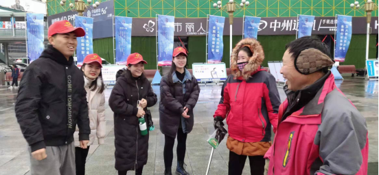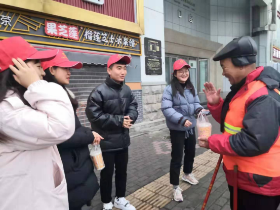 7点30分,同学们到达二七广场,各组分配工作之后,同学们开始送温暖行动。空中寒风凛冽似乎还带点小雨,淅淅沥沥的打在环卫人员的身上,他们仍然辛勤的工作着。同学们连忙跑过去,看到他们的双手因要拿工具打扫而冻的通红。