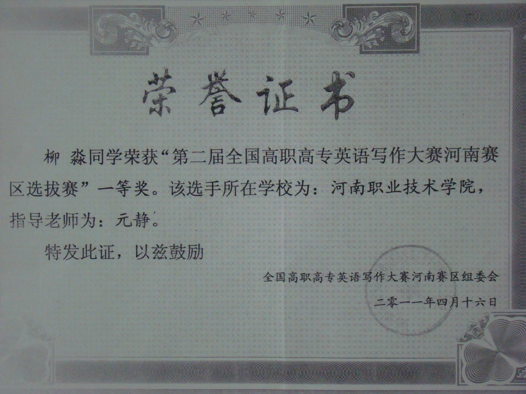 上一条:2013年全国职业院校技能大赛高职组现代物流储存与配送作业优化设计和实施比赛团体三等奖 下一条:全国高职高专英语写作大赛河南赛区选拔赛一等奖