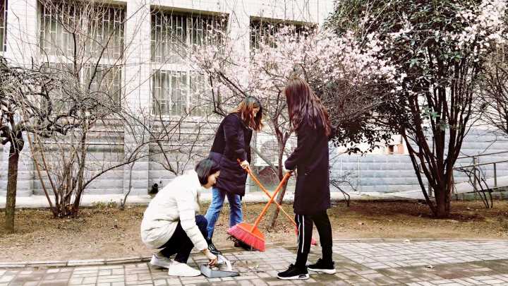 志愿者小组在打扫校园