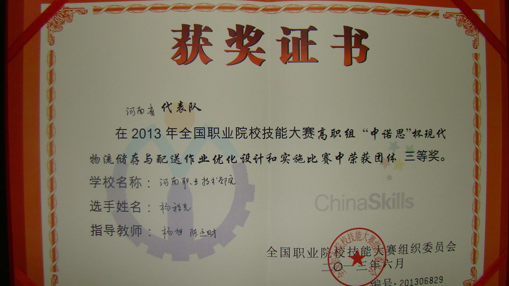 本次大赛由教育部主办,共有63支国内队和来8支国际队参赛。公司工商管理系物流管理专业的刘旋、郭川粮、黄珍娜和杨成光四位员工组成的代表队,在该专业老师陈运财和杨旭的带领下,赛前精心准备、认真演练、大胆创新,赛场上凭借娴熟的技能和良好的素质在方案制作、技能测评和实际操作等环节步步为营、稳扎稳打,最终取得团体三等奖的优秀成绩。这是公司员工在此赛项中取得的最好成绩,也是我省代表队在此赛项在上取得的唯一奖项。
