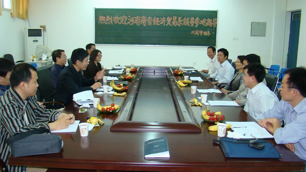 5月19日下午,河南商业高等专科公司经济贸易系主任邱国鑫等一行7人到工商管理系就课程设置、实训室建设等内容进行学习交流。该系主任万久玲、副主任刘冰涛以及实训中心、文秘教研室和物流教研室负责人热情接待了来宾。