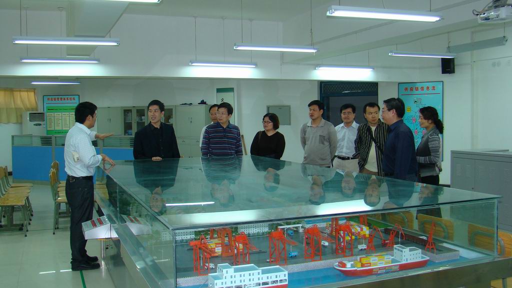 在系主任万久玲等有关人员的陪同下,来访客人参观了营销沙盘实训室、物流管理实训室等,并合影留念。