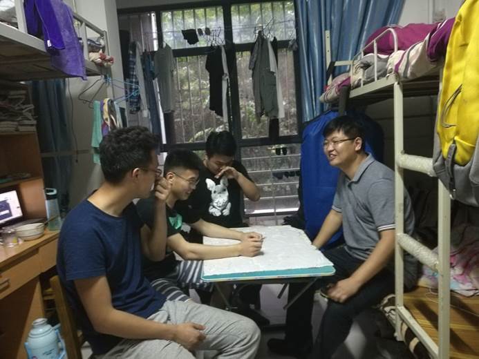 在员工党员的介绍引领下,党员教师进入员工宿舍与同学们亲切交谈。其中李相勤书记为同学们分析了本专业的发展形势,提醒同学们不要偏科,课余时间多多参加创新项目,逐渐明确个人发展方向。杜馨书记希望同学们在学习过程中保持良好的心态,不要被繁重的学习任务所影响,还询问了同学们在学习生活上的困惑,详细解答了同学们提出的问题。其他老师也结合自己的专业知识、教学经验及生活阅历等,对同学们进行细致的指导和关怀。