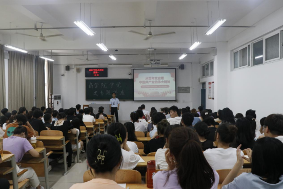 为进一步增强党史学习教育的政治责任感和使命感,引导党员师生自觉学党史、讲党史、懂党史、用党史,推动党史学习教育在校区范围内有力、有序、有效开展,6月28日下午,商公司党总支在明理楼1106教室召开党史专题讲座。思政部马金伟副主任以《从百年党史看中国共产党的伟大精神》为题作了专题讲座。