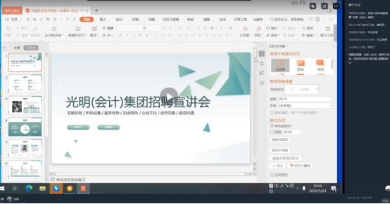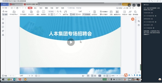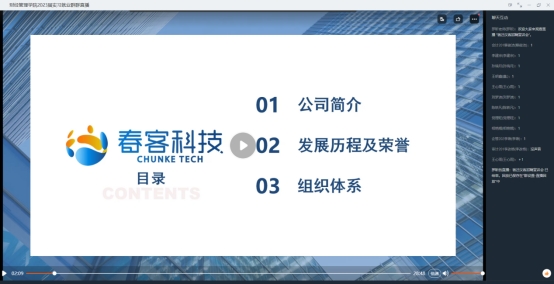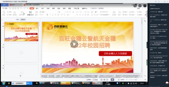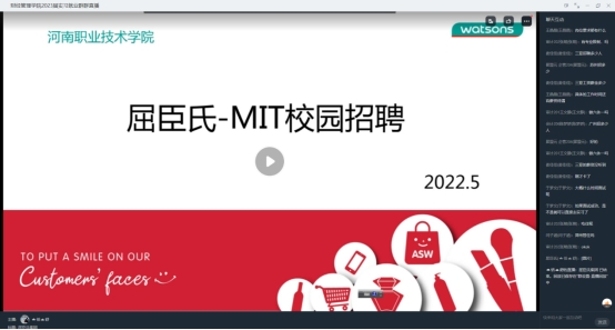 此次参与线上专场招聘的企业有屈臣氏个人用品有限公司、河南航天金穗电子有限公司、沪上名家装饰有限公司、宁波晨希网络科技有限公司、浙江人本集团、河南光明会计师事务所等20余家公司,各个企业的招聘负责人向公司员工介绍了企业情况、发展前程、职工待遇,提供了适合公司员工专业的实习岗位。并详细介绍了员工实习过程中的专业发展、人才培养目标及招聘规模,并结合当前疫情形势,解答了同学们一系列关于企业实习工作的相关问题。