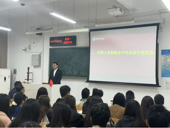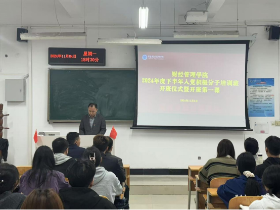 仪式在庄严的国歌声中拉开帷幕。首先,本期入党积极分子代表郭子祺发言,表示培训期间将严格遵守纪律,认真学习党的相关理论,做到学有所获,理论学习入脑入心。随后,马金伟作开班致辞,他指出,本次集中培训是发展党员工作的重要环节,对端正入党动机,从源头上保证发展党员质量具有重要意义。他要求全体入党积极分子,1、要端正学习态度,明确目标,深入理解党的理论,提升政治素养;2、要勤奋学习,积极思考,明确自身使命和责任;3、要严守纪律,塑造自身良好形象;4、要将理论学习与实际结合,提升个人素质。他希望全体入党积极分子能以此次党课为契机,设定远大目标,学思结合,保持对党的忠诚和信仰,将个人理想融入国家发展大局,继承和发扬党的优良传统,做到“思想上入党,行动上入党,组织上入党”。接下来,由马金伟领誓,全体成员面向党旗庄严宣誓。最后,余湾为入党积极分子上了开班第一课《中国共产党章程》。