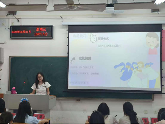 活动现场,参评同学依次上台,立足本职工作,结合自身岗位认知,展开了精彩分享。他们详细讲述了自己组织开展的一系列丰富多彩的心理健康活动,充分展现了在推动心理健康教育工作中的积极作为。分享心得感悟环节,同学们纷纷表示,在参与心理健康工作的过程中,不仅帮助了他人,也实现了自我成长。他们深刻体会到了心理健康工作的重要性和意义,更加坚定了为同学们服务的决心。