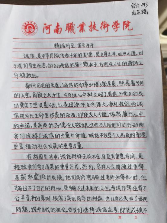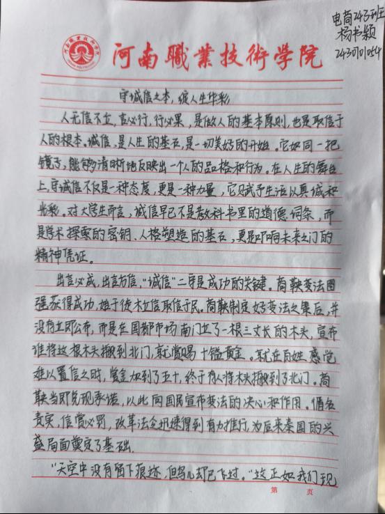 经过严格的评审,一批优秀作品脱颖而出。其中会计245杨盛楠、市营241张可依二人荣获一等奖,审计242韩悦悦、会计241赵晨璐、会计245韩迪三人荣获二等奖,会计243白芷瑶、电商243杨书颖、会计246黄帅男、会计241韩雪露、企管242董佳慧五人荣获三等奖。获奖同学纷纷表示,参加此次诚信主题征文活动让他们对诚信有了更深刻的理解和认识,在今后的学习和生活中,将时刻牢记诚信的重要性,自觉践行诚信准则,用实际行动传递诚信正能量。