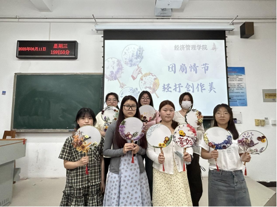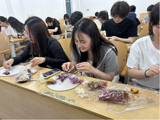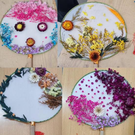 活动现场,五彩斑斓的干花、素雅的团扇整齐摆放。在老师的指导下,同学们纷纷拿起工具,发挥创意,将干花巧妙地粘贴在团扇上。每一把团扇都成为同学们内心世界的独特表达,承载着他们的梦想与情感。在制作过程中,同学们相互交流、分享创意,欢声笑语回荡在活动现场。原本陌生的同学因共同的兴趣爱好拉近了距离,增进了彼此的了解与友谊。